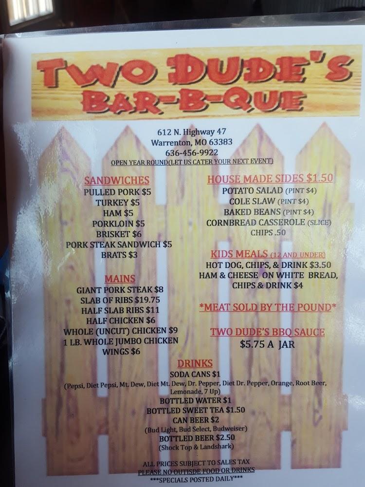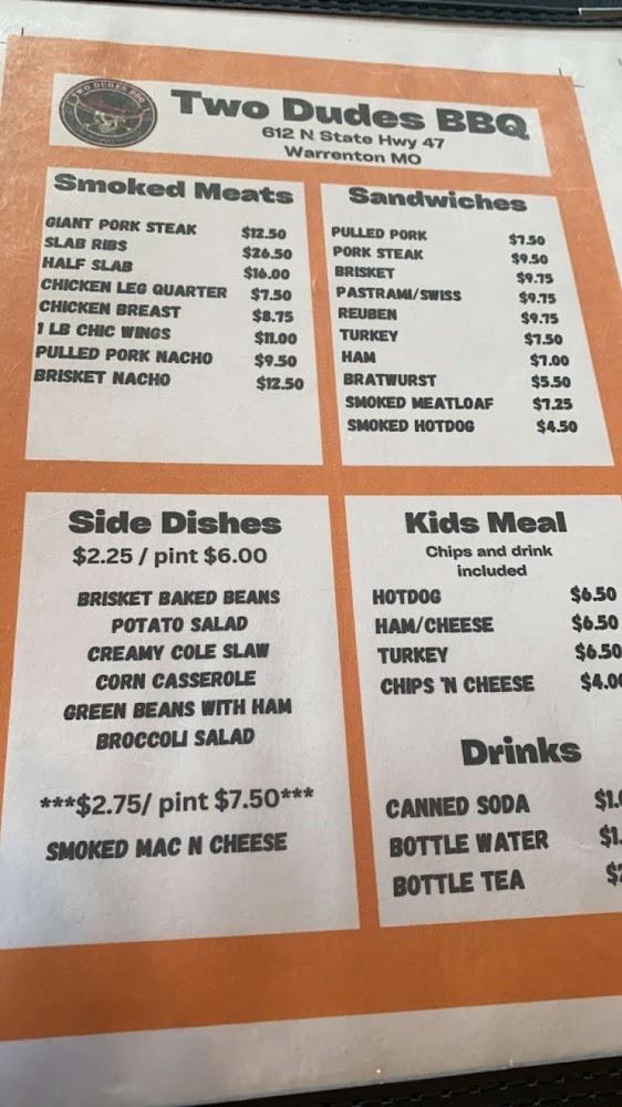 Welcome to Two Dudes Barbeque LLC, your go-to family-owned BBQ restaurant in Warrenton, MO! We proudly serve up hot and fresh BBQ six days a week, ensuring a mouthwatering experience for every guest. Our cozy atmosphere is perfect for solo diners or groups looking to indulge in local specialties, with options for dine-in, takeout, and delivery. Don't miss out on our delicious offerings, available until we're sold out! Enjoy a casual dining experience, complete with accessible facilities and a selection of beverages. Stop by at 612 State Hwy 47 or call us at +1 636-456-9922 for a memorable meal!